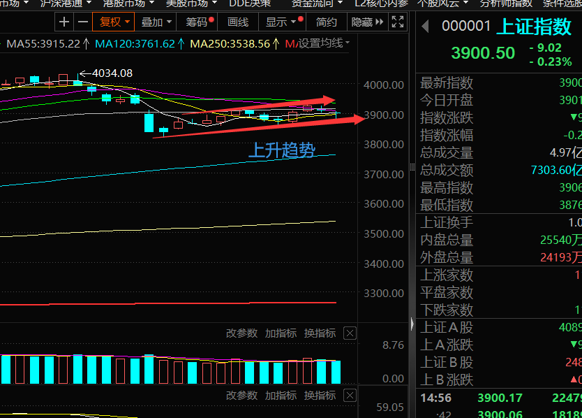 今天的盘面不温不火,有点无聊,全天缩量1255亿,回到了1.8万亿以下,总体来说搞钱效应平平,但是细节之处可以看出控盘水平,今天刚好踩在上升趋势线的位置回升,从今天尾盘的节奏来看,明天大概率还是震荡节奏为主。下午全看房地产板块及时拉一下,硬生生把指数的跌势挽回一半,最近大家多看少动,不宜频繁换票。