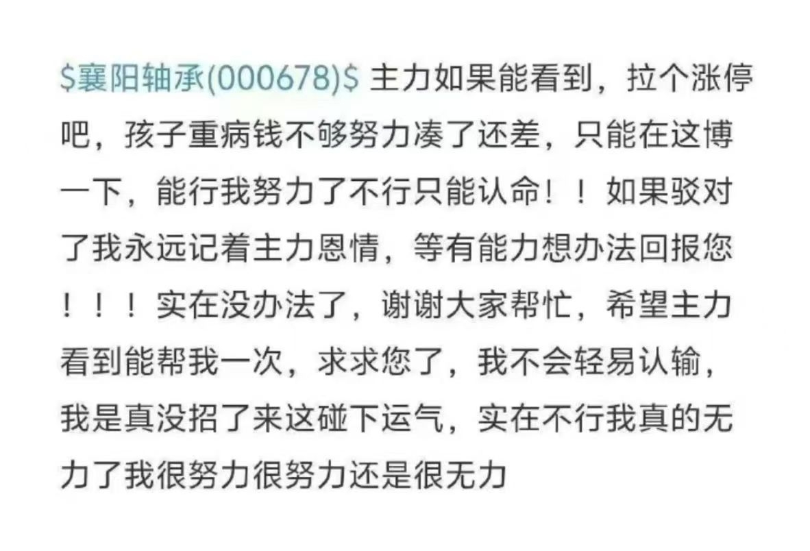 之前有只股票,一个吧友喊话庄家,大致内容是说自己孩子病了需要涨停救命,结果那天没