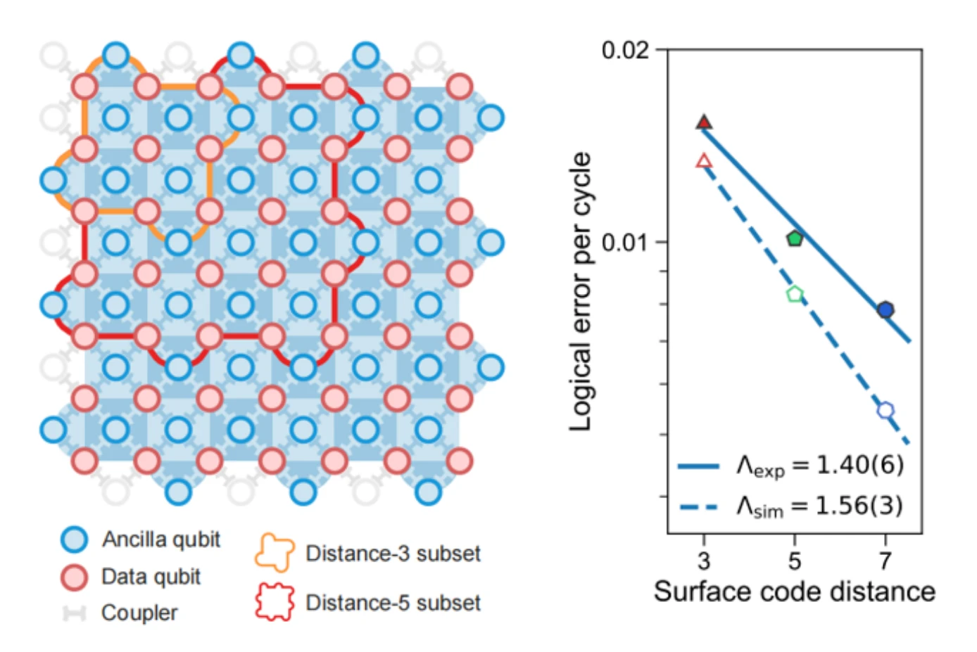 合肥国家实验室/中国科学技术大学超导量子计算研究团队在国际上较早布局表面码量子纠错研究。2022年,研究团队基于“祖冲之2号”超导量子处理器率先实现了码距为3的表面码逻辑量子比特,首次验证了表面码方案的可行性。2023年,谷歌实现了码距为5的表面码纠错。受限于当时较高的物理量子比特各类错误水平,以上工作都未能真正突破纠错阈值。