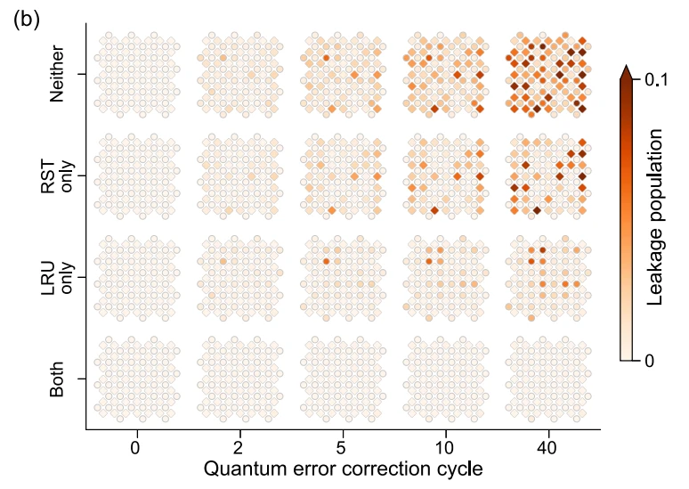 然而,量子纠错需要引入大量额外的量子比特和量子门操作,导致更多的噪声源和错误通道。如果物理量子比特的原始错误率过高,增大纠错码距带来的额外错误反而会淹没纠错带来的收益,导致“越纠越错”。在所有错误类型中,“泄漏错误”尤为致命——量子比特会脱离预定的计算能级,进入无法通过表面码直接纠正的无效状态。随着系统规模的扩大,泄漏错误的累积效应将成为阻碍纠错性能提升的主要瓶颈。