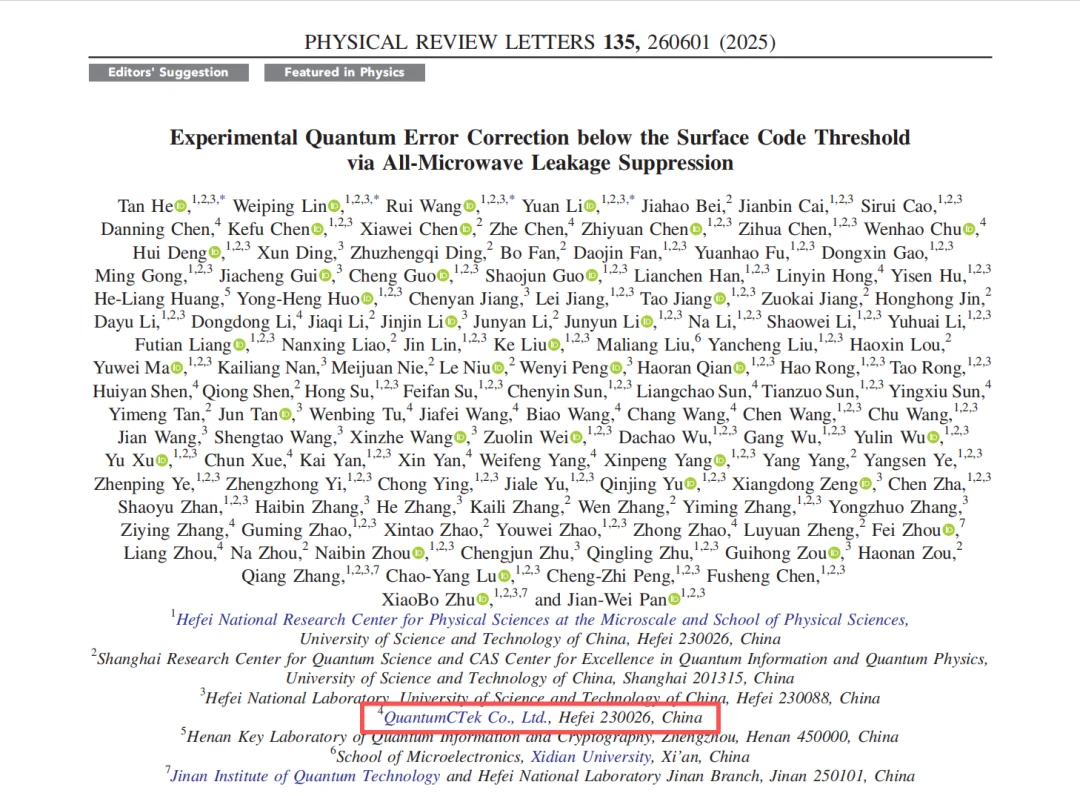 合肥国家实验室/中国科学技术大学潘建伟、朱晓波、彭承志和陈福升等,基于超导量子处理器“祖冲之3.2号”在码距为7的表面码上实现了低于纠错阈值的量子纠错,演示了逻辑错误率随码距增加而显著下降。这一成果使得我国达到了“低于阈值,越纠越对”的关键里程碑,同时也开辟了一条较美国谷歌公司更为高效的“全微波控制”新路径,为未来大规模容错量子计算奠定关键技术基础。12 月 22 日,该成果以封面论文和“编辑推荐”的形式发表于国际物理学权威学术期刊《物理评论快报》。