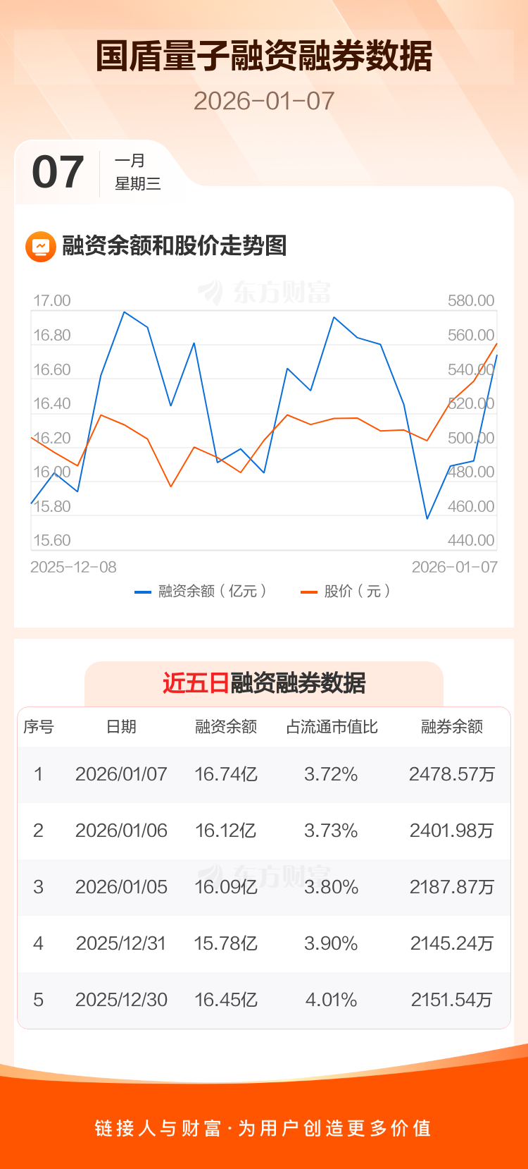 交易所最新数据显示,国盾量子于2026年1月7日获融资买入2.78亿元,融资偿还2.16亿元,当日融资净买入6215.96万元。目前,该股融资余额16.74亿,占流通市值比例为3.72%。