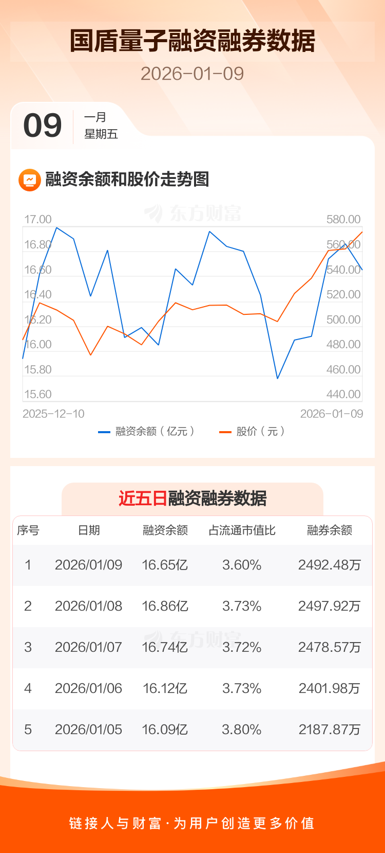 交易所最新数据显示,国盾量子于2026年1月9日获融资买入1.81亿元,融资偿还2.02亿元,当日融资净偿还2075.24万元。目前,该股融资余额16.65亿,占流通市值比例为3.60%。