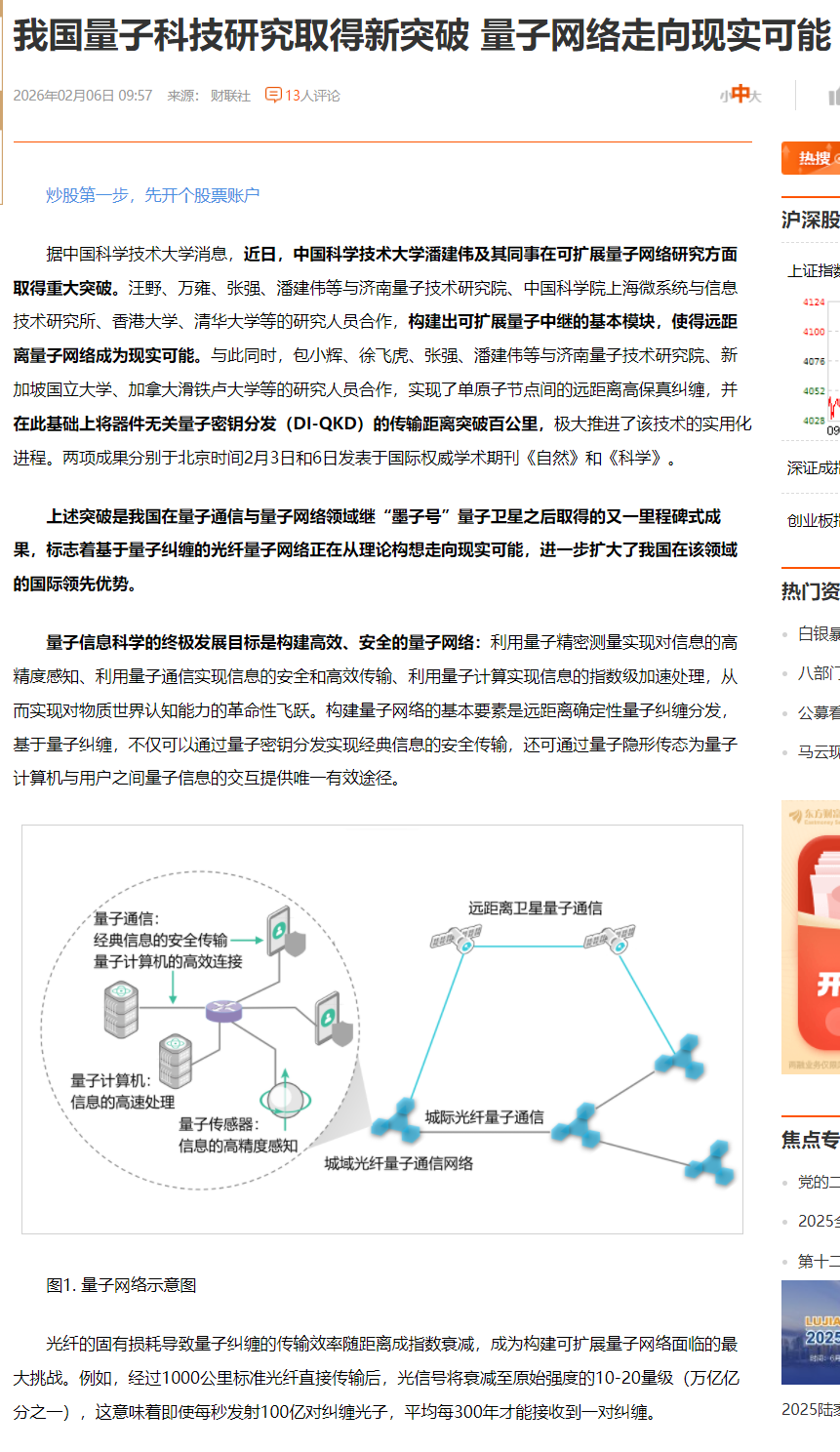 2026年2月,中国量子科技领域迎来历史性时刻:中国科学技术大学潘建伟团队相继在国际权威学术期刊《自然》《科学》发表两项重大成果,成功构建可扩展量子中继基本模块、实现百公里级器件无关量子密钥分发(DI-QKD),彻底打破制约远距离量子网络发展的技术瓶颈,标志着我国量子网络从理论构想迈向现实可能,再次巩固了我国在全球量子科技领域的领先地位。