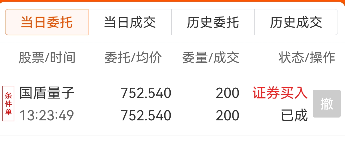 $国盾量子(SH688027)$ 主力太浪了,挂的750即时价条件单,一口吃下去了,给我752成交的。偏离均线太远了,应该稳稳,年后突击啊。 认单服输,让你把我挂山头吧,过年期间我替大家站岗了,年后来人换岗哈