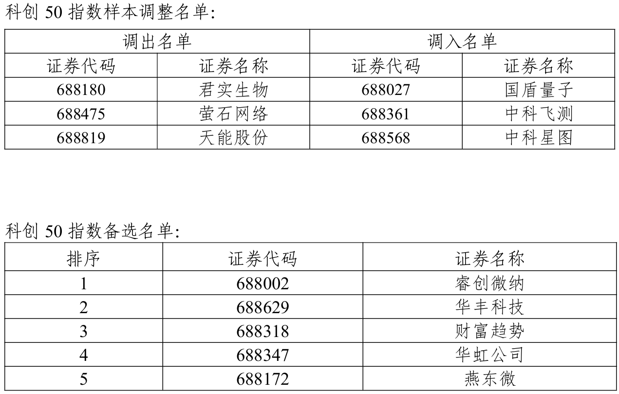 科创50指数样本调整!3只个股被调入名单