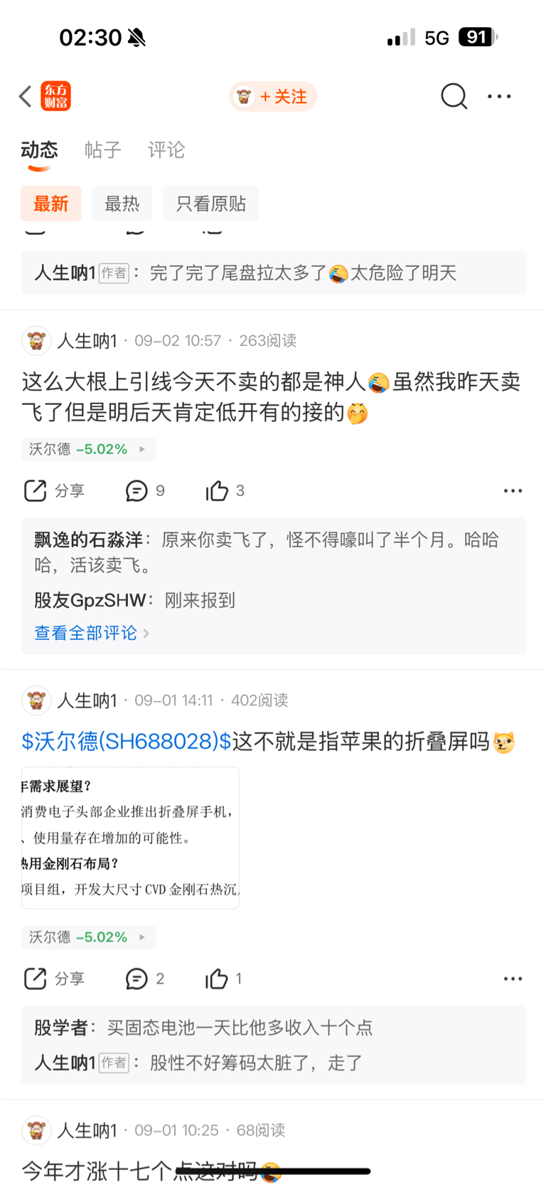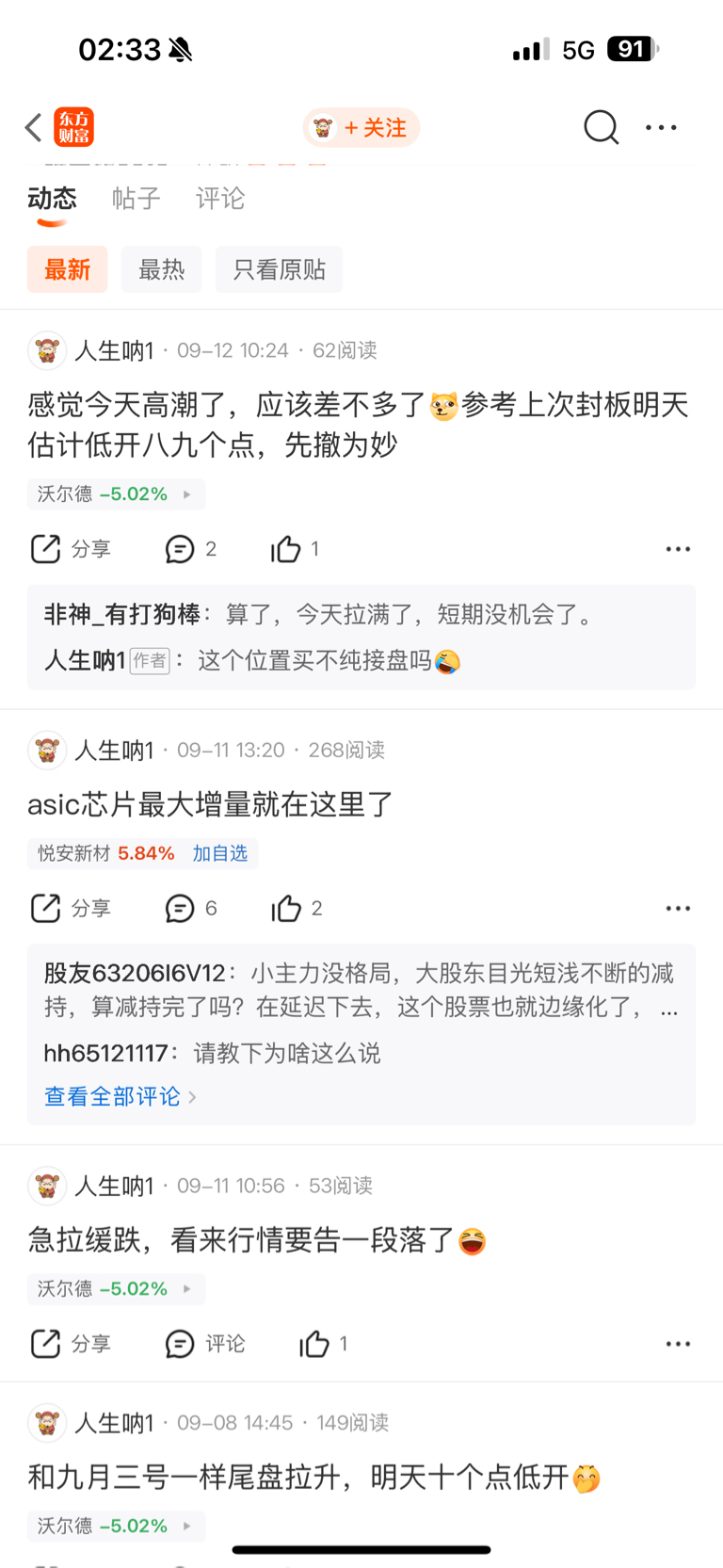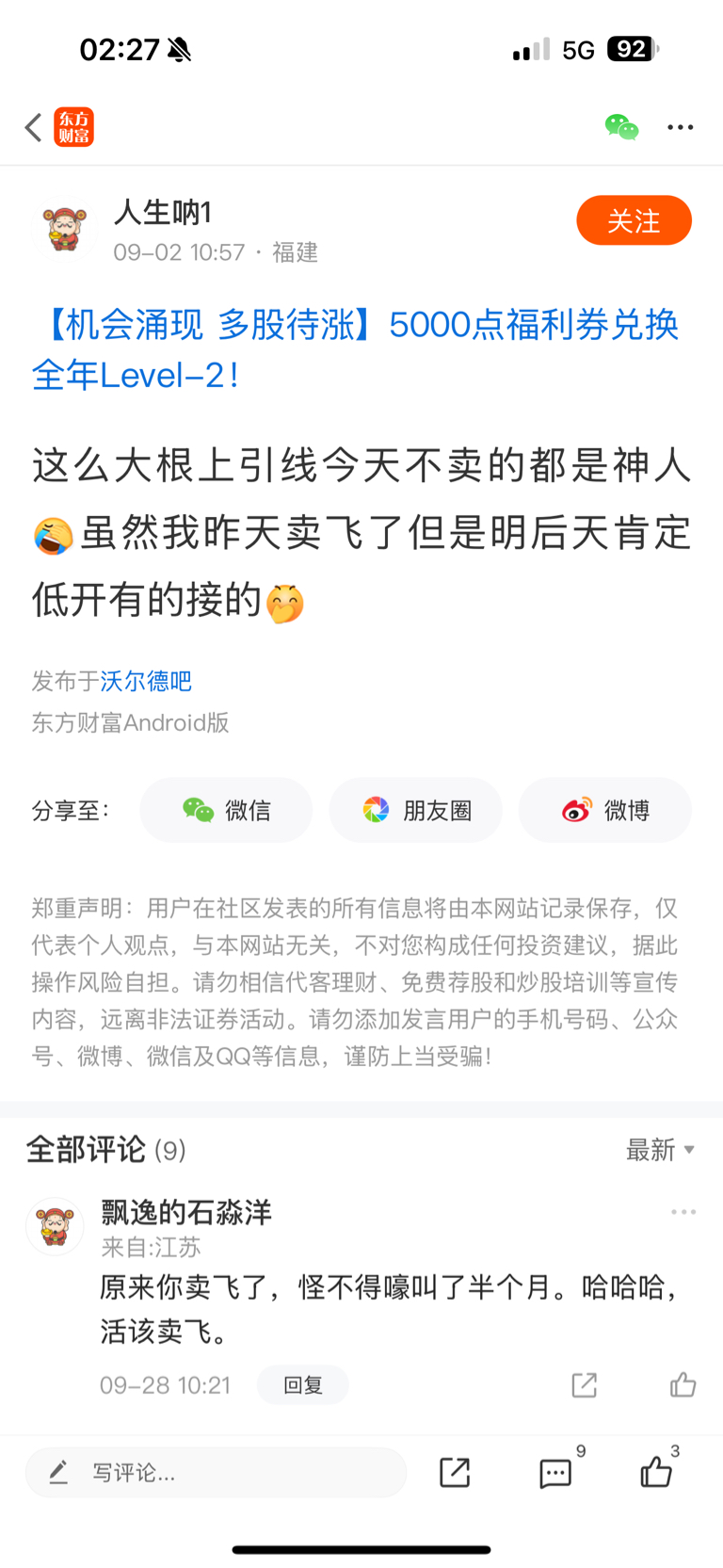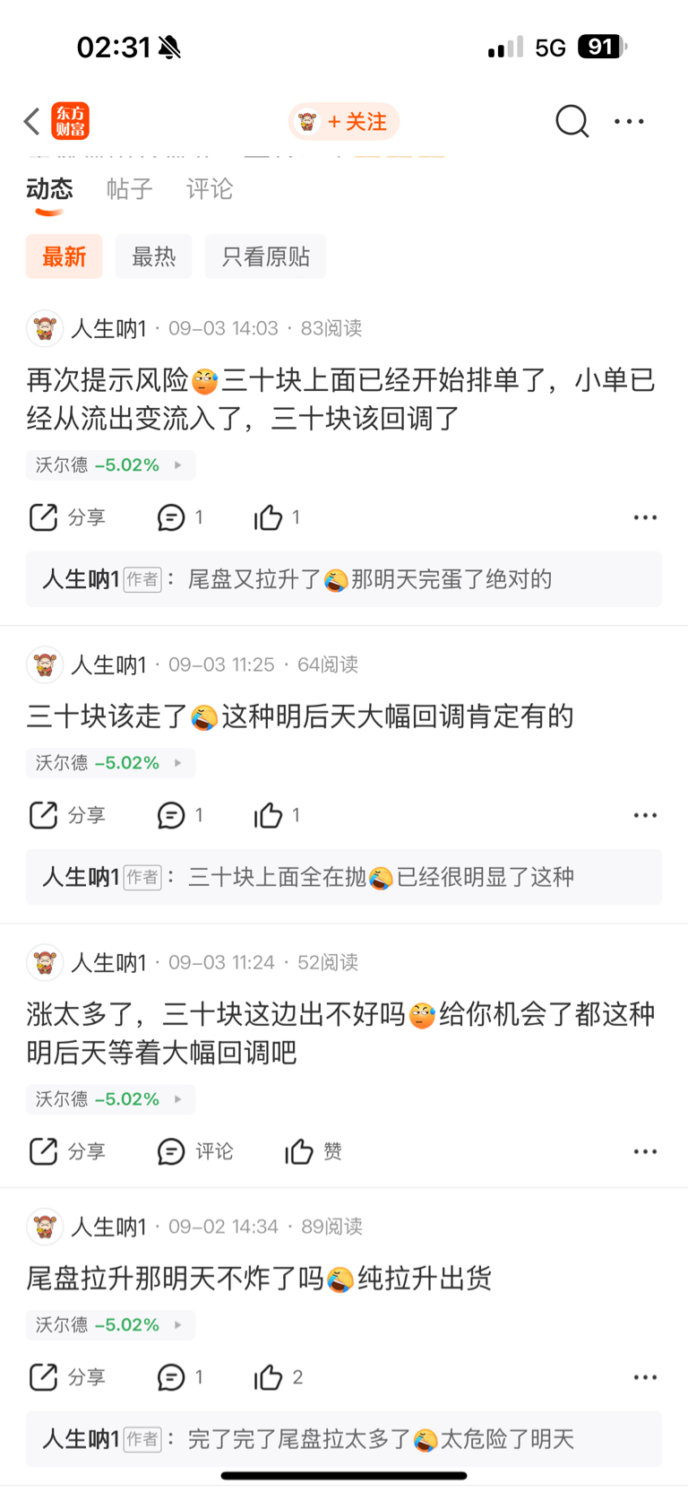 从9月2号就在评论自己卖飞了,正常如果卖飞是不会在这个股票上一直bb的,中途没有任何一个贴子说的是自己买回来了,一直在看空见顶!我发出来的意思是大家多空双方都有自己的思维,并且还有一些新进来的人,不要被这种刚从医院出来的人带偏了,或者影响自己的判断。