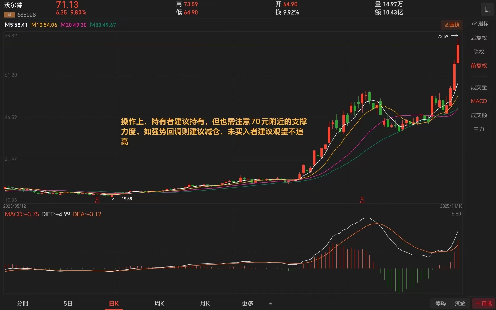 $沃尔德(SH688028)$ 当前K线与均线系统皆呈现强势趋势,超硬刀具与金刚石材料双轮驱动,海外订单增长明显,基本面有支持,操作上,持有者建议持有,但也需注意70元附近的支撑力度,如强势回调则建议减仓,未买入者建议观望不追高。