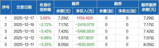 融资方面,当日融资买入4199.4万元,融资偿还3039.9万元,融资净买入1159.49万元。融券方面,融券卖出0股,融券偿还0股,融券余量0股,融券余额0元。融资融券余额合计7.29亿元。