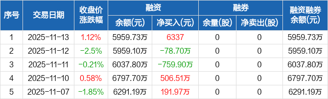 融资方面,当日融资买入499.4万元,融资偿还498.77万元,融资净买入6337元。融券方面,融券卖出0股,融券偿还0股,融券余量0股,融券余额0元。融资融券余额合计5959.73万元。