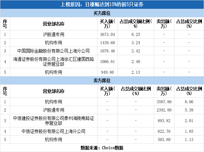 上交所2025年1月24日交易公开信息显示,星环科技因属于日涨幅达到15%的前5只证券而登上龙虎榜。星环科技当日报收48.10元,涨跌幅为17.32%,换手率10.37%,振幅19.71%,成交额4.45亿元。