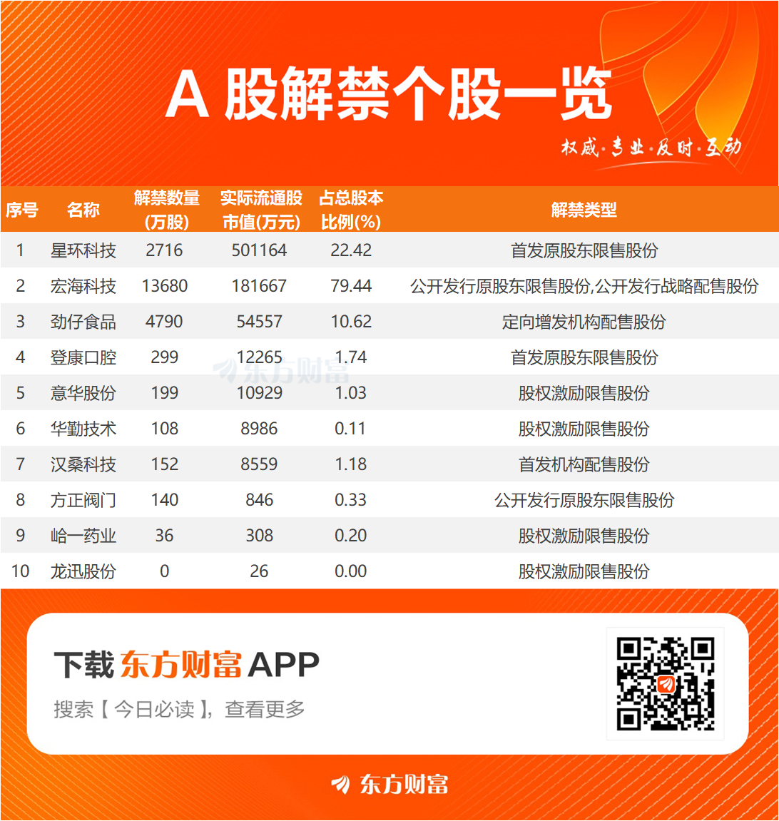 【明日解禁】明日10股解禁 星环科技、宏海科技解禁市值居前