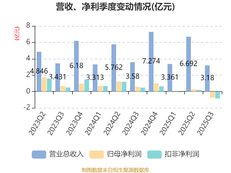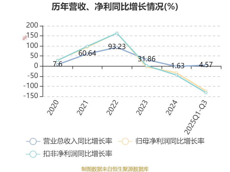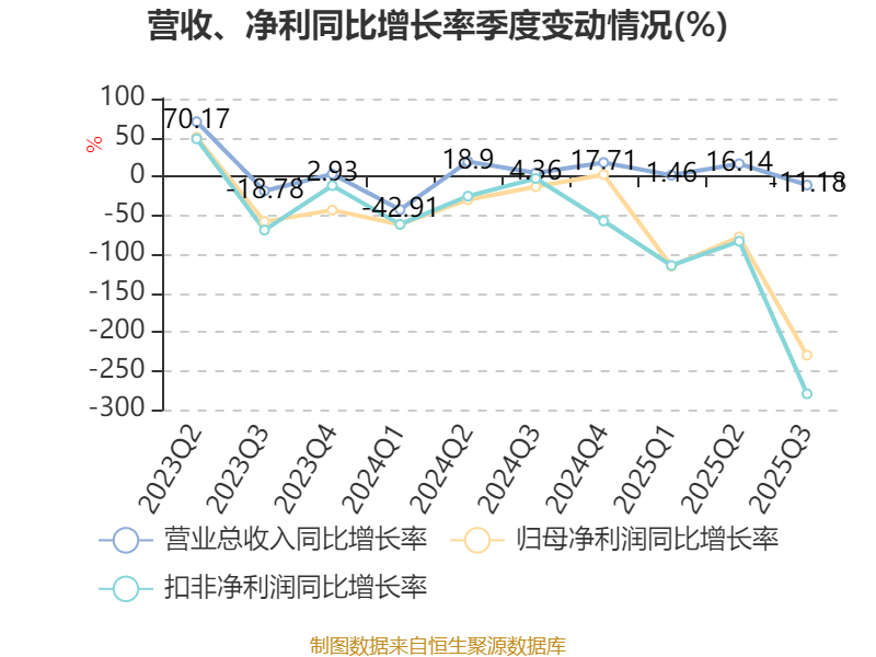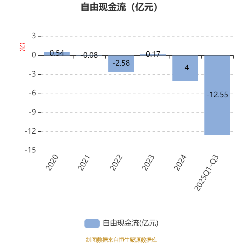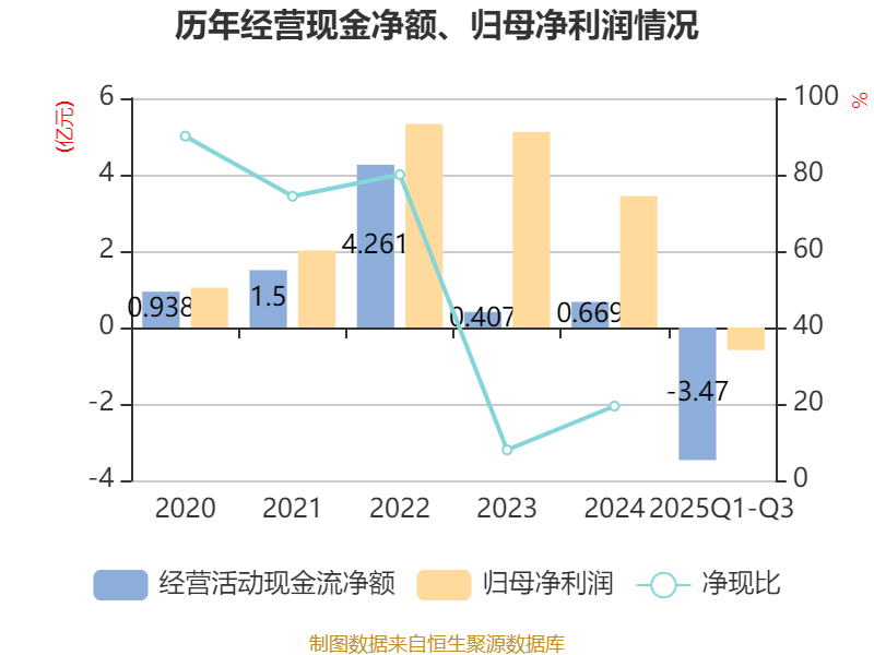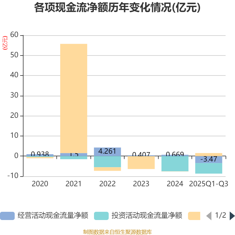 2025年前三季度,公司经营活动现金流净额为-3.47亿元,同比减少4.2亿元;筹资活动现金流净额1.51亿元,同比减少3531.71万元;投资活动现金流净额-5.22亿元,上年同期为-6.89亿元。