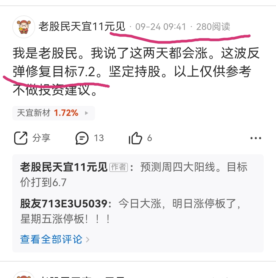 $天宜新材(SH688033)$ 我是老股民。九月份能精准预测天宜能打到7.20。已经证明我的实力。直接说重点。我们深圳五家私募机构召开电话会议得出惊天结论。本月底前天宜能打到8元上方。11月底前能打到11元上方。我们拭目以待。什么CALM渔夫这两个杂毛。对大家一点帮助都没有。影响大家坚定持股。早点拉黑即可。我才是天宜股吧一哥。听我一人即可。继续坚定持股。以上仅供参考不做投资建议风险自担