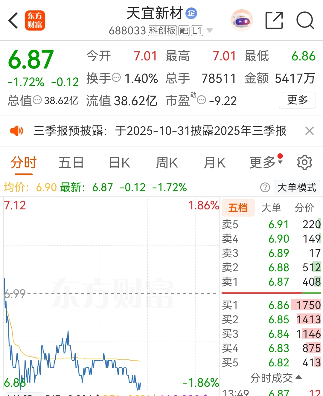 $天宜新材(SH688033)$ 我是老股民。已经建仓的粉丝答应我锁仓不动一个月。是我老股民在最困难的时刻。站出来鼓励大家坚定持股。渔夫和CALM那两个杂毛。根本帮不上大家。今天回踩60日均线6.87。明天开始极限反弹概率很大。我们拭目以待吧。日后涨上去请记得我老股民在大家最困难的时刻给大家勇气。以上仅供参考不做投资建议风险自担