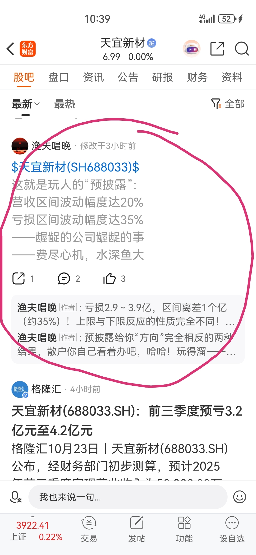 $天宜新材(SH688033)$ 我是老股民。昨天就精准预测今天会大阳线反攻。服不服。我才是真正能帮助大家的那个男人。大家快来看看CALM渔夫M10昨天的看空观点。毫无水平。影响大家操作。快来取笑他们三个小丑。我才是天宜股吧一哥。这三个大家拉黑即可。不要耽误大家继续持仓。以上仅供参考不做投资建议风险自担。