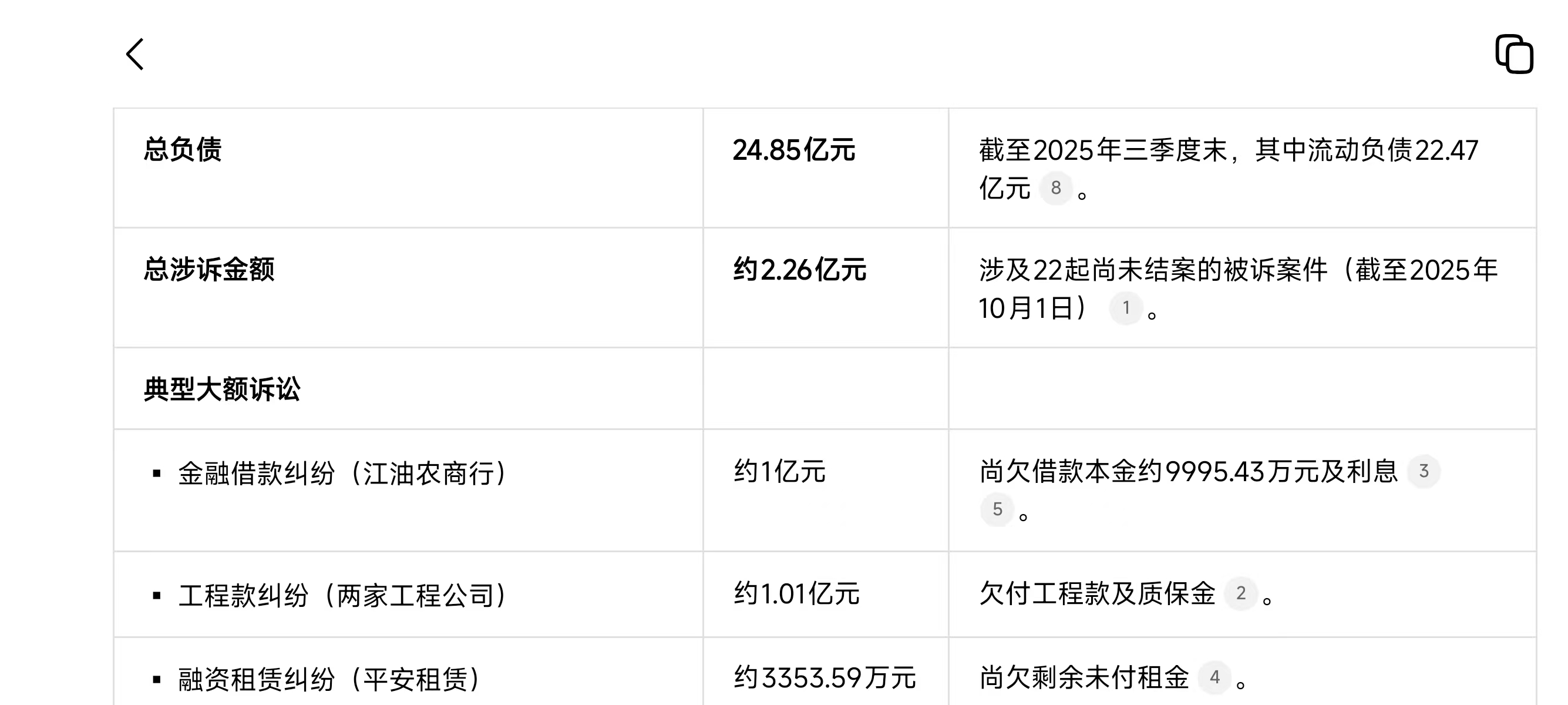 根据公开信息,截至2025年三季度末,天宜新材的负债总额为24.85亿元。其具体的欠款和债务纠纷情况,可以通过下表快速了解: