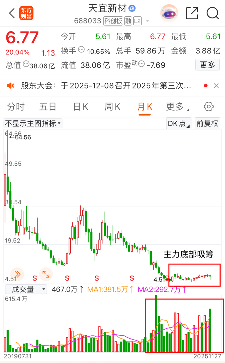 $天宜新材(SH688033)$ 看看月线连续19个月低部巨量资金进入,难道就为一个板!#炒股日记# #强势机会#