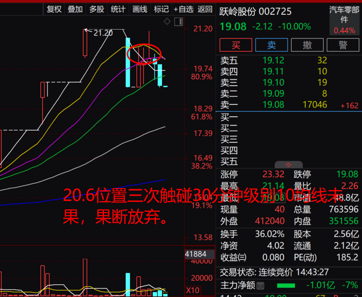 跃岭股份:是国内铝合金车轮行业的重要企业,公司持有中石光芯10.05%股权,中石光芯是国内少数掌握光芯片研发生产完整核心技术链的企业,已经3板了,今天水下开按在地板,幸亏盘中反弹,但始终无法回收失地。20.6在30分钟级别10均线三次触碰无法突破,果断放弃。不过整体收获超过30%,这波龙哥也算不负所望。