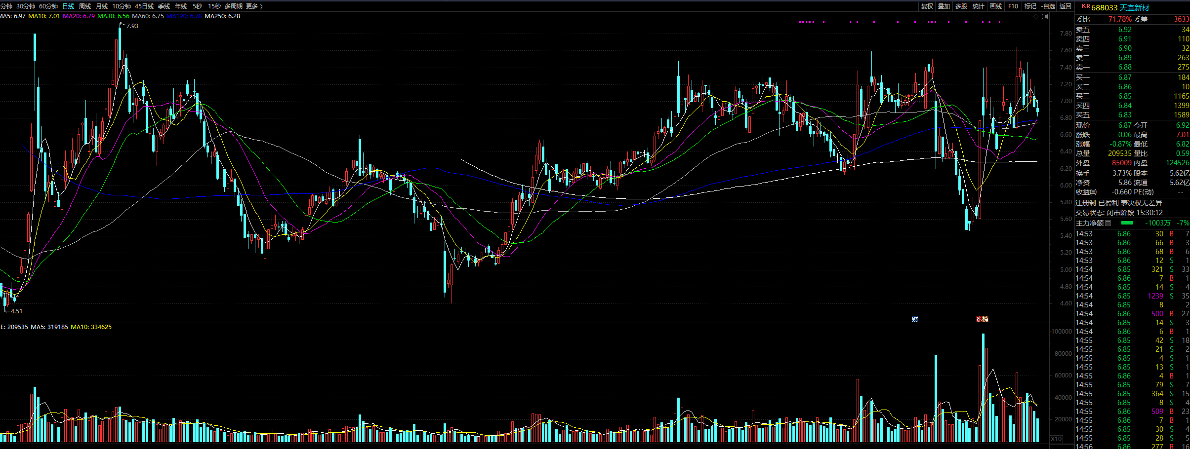 天宜新材目前的走势图:两种的走势和量价关系,都还是有点神似的
