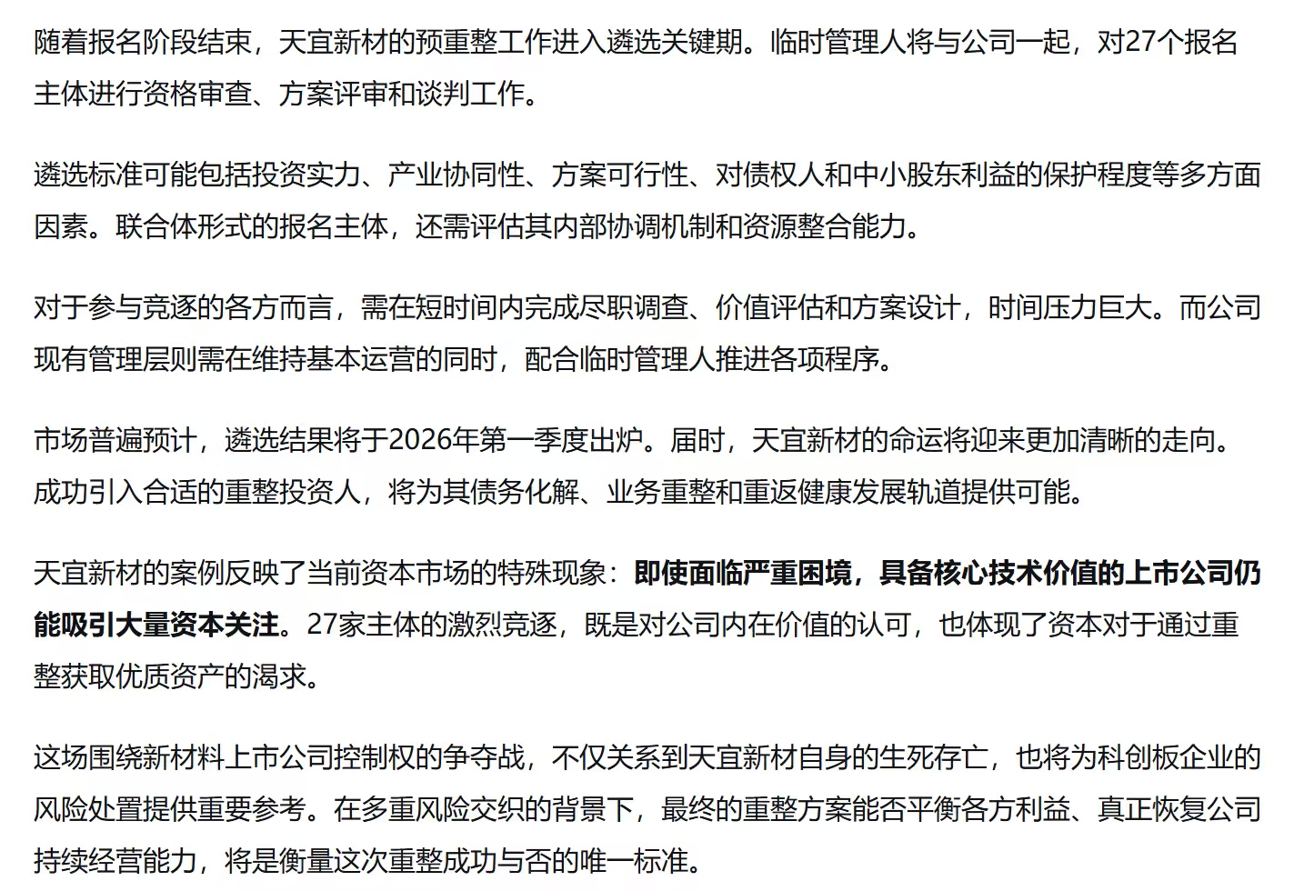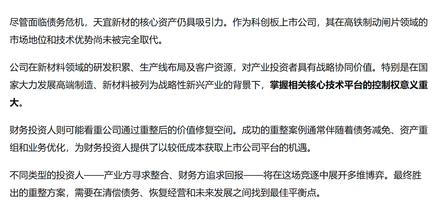 $天宜新材(SH688033)$ 天宜整个盘子还是比较简单的,没有太复杂的纠纷,亏损的光伏项目已经停产,现金流有点紧张,新的投资人只要注入一定现金流,把亏损光伏业务剥离,在商业航天领域做一些业务赋能,很快就能重新起来,再说了北京的商业航天公司不少,天宜在北京资源对接非常容易,海问律所也是这个行业的重整大佬,而且进度非常快,如果真能重整成功,那将是26年妖股大热门