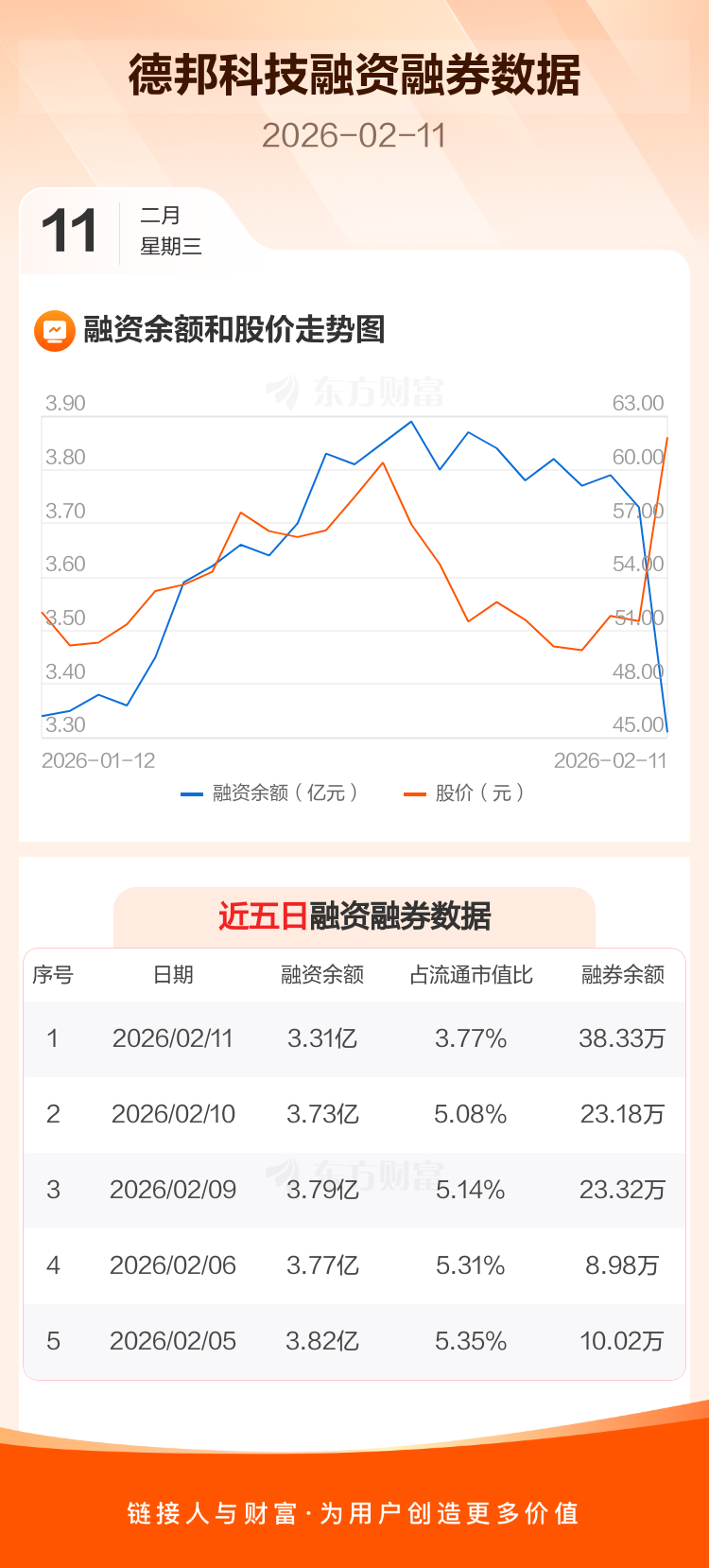 交易所最新数据显示,德邦科技于2026年2月11日获融资买入1.06亿元,融资偿还1.47亿元,当日融资净偿还4110.14万元。目前,该股融资余额3.31亿,占流通市值比例为3.77%。