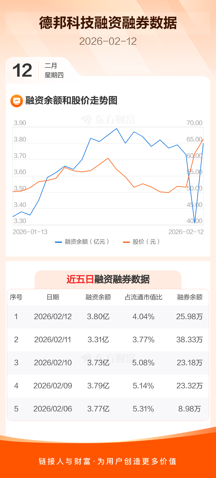 交易所最新数据显示,德邦科技于2026年2月12日获融资买入1.78亿元,融资偿还1.29亿元,当日融资净买入4878.01万元。目前,该股融资余额3.80亿,占流通市值比例为4.04%。