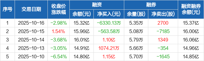 传音控股融资融券信息显示,2025年10月16日融资净偿还6330.13万元;融资余额15.32亿元,较前一日下降3.97%。