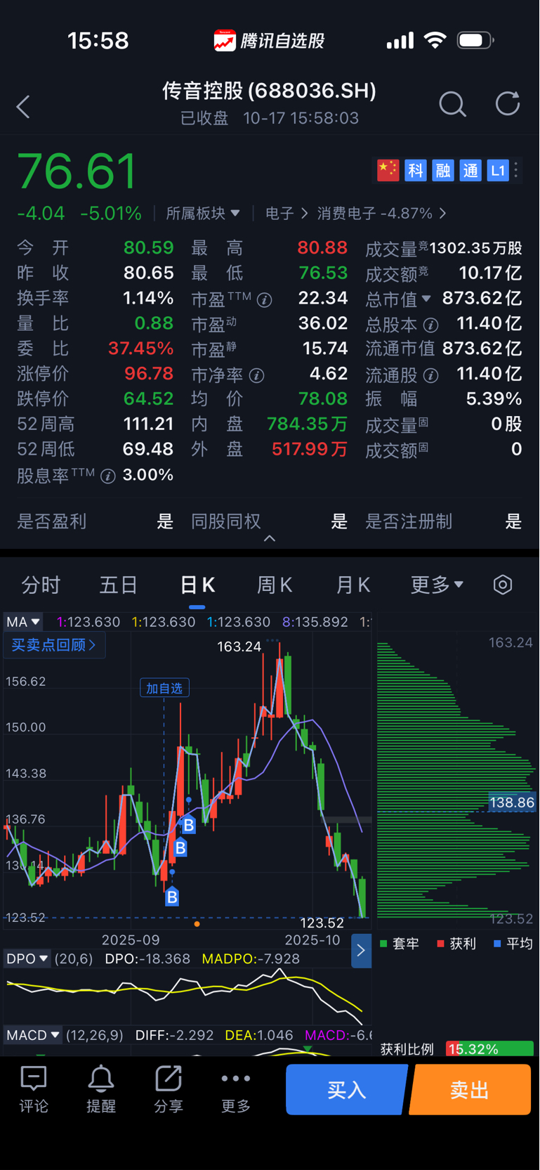 $传音控股(SH688036)$ 下跌的时候接刀子也就你们小白能干出的事,下跌不猜低,你看这筹码峰都补满了,怕踏空就只能亏损没有那个股市是一天涨起来的,根据可靠新闻,传音控股准备去港交所上市融资10亿美金,按照正常的稀释比例10%到20%估值大概在350亿到600多亿之间,因为还不知道准确的稀释比例