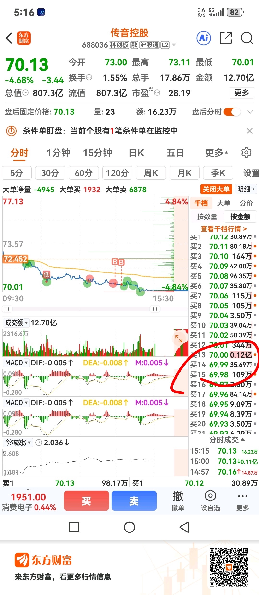 $传音控股(SH688036)$ 在70的位置上有1200万的承接,但是并没有掉到70,是不是可以说明主力并不想真出货。如果准备明天掉到70以下,那为什么不在今天直接出掉呢。估计是洗盘吸筹。