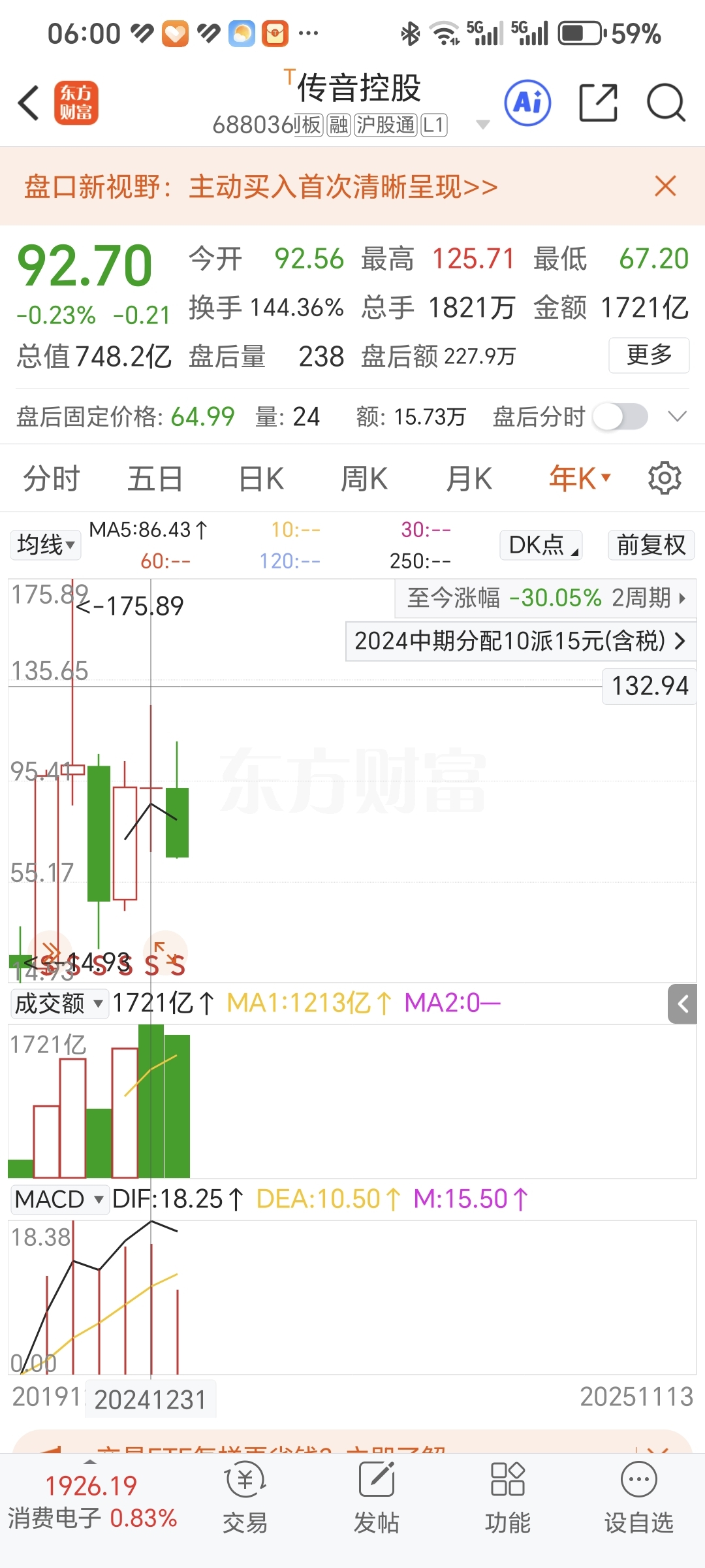 $传音控股(SH688036)$ 这是传音控股的年线,去年收盘价92.7元,如果今年到不了92.7,明年一定会到92.7。