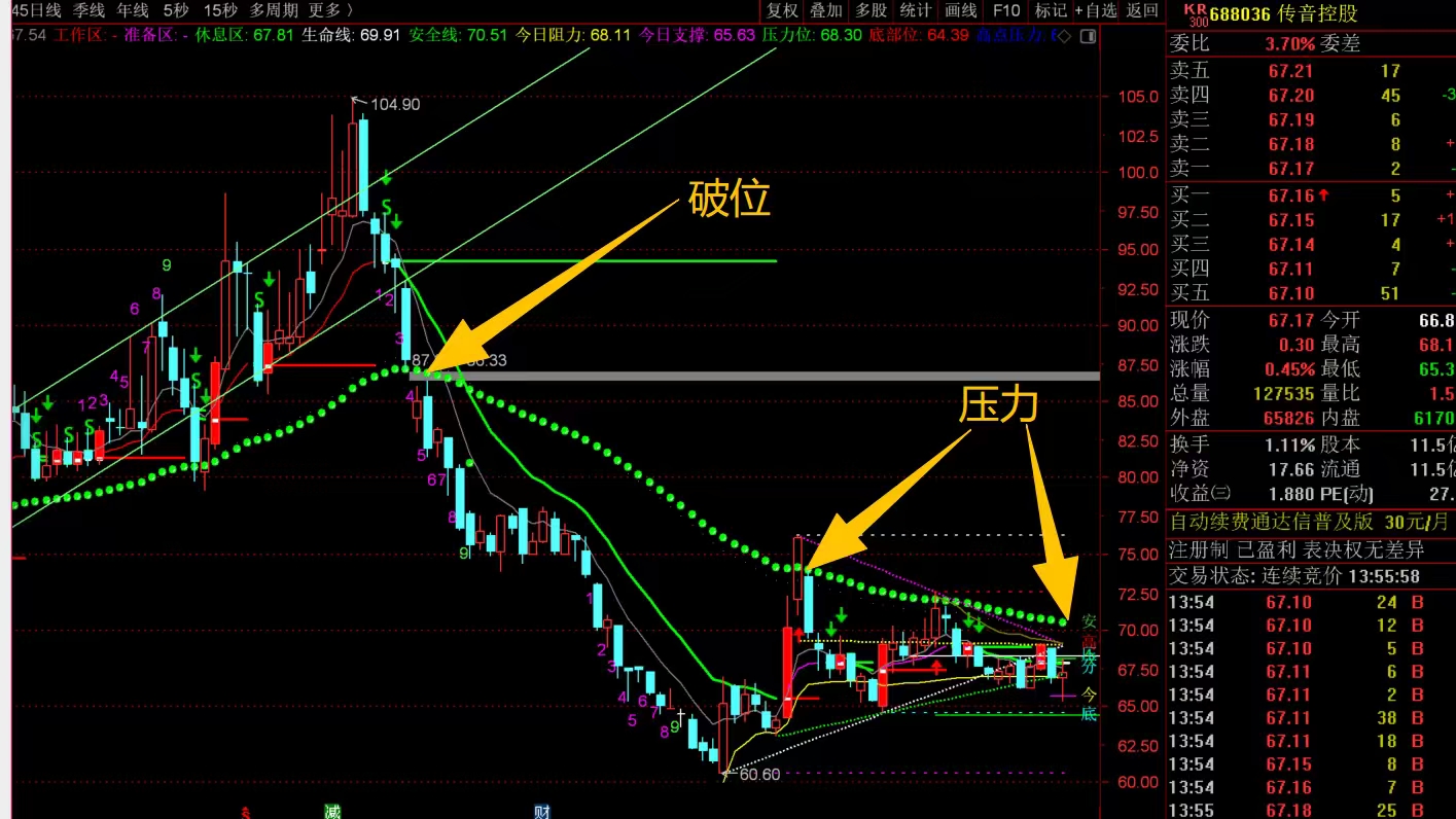$传音控股(SH688036)$ 中期趋势走弱了,主要是前期高位回落后,跌破安全线86.94附近后,没有反弹,形成破位走势,当时就需要大幅减仓应对,不然回落到现在很被动。短线来看,目前还是下降周期,不建议折腾,观察的话就看头上安全线70.51位置能不能冲上,能冲上站稳还行,站不稳就注意再次回落的风险了。#炒股日记# #收盘点评#