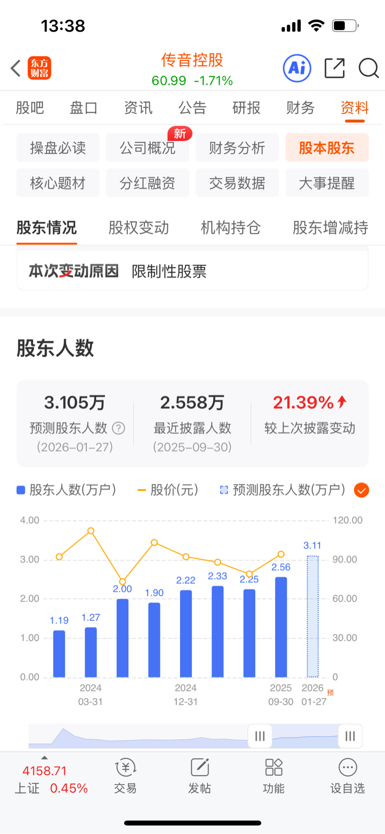 $传音控股(SH688036)$ 股东人数增加了21.39%,户数增加这么多,判定不是主力所为,主力不愿意拉升散户扎堆的股票。