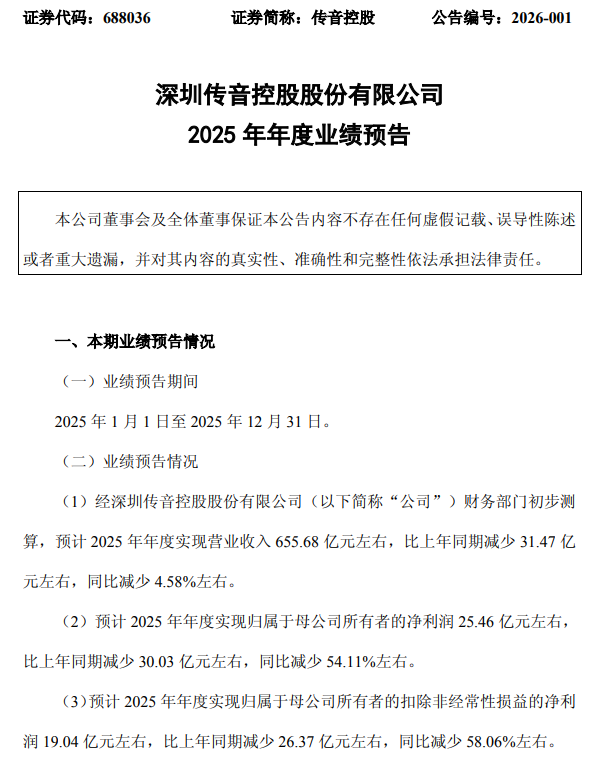 1月30日,传音控股(688036)披露2025年年度业绩预告,公司预计2025年净利同比腰斩。