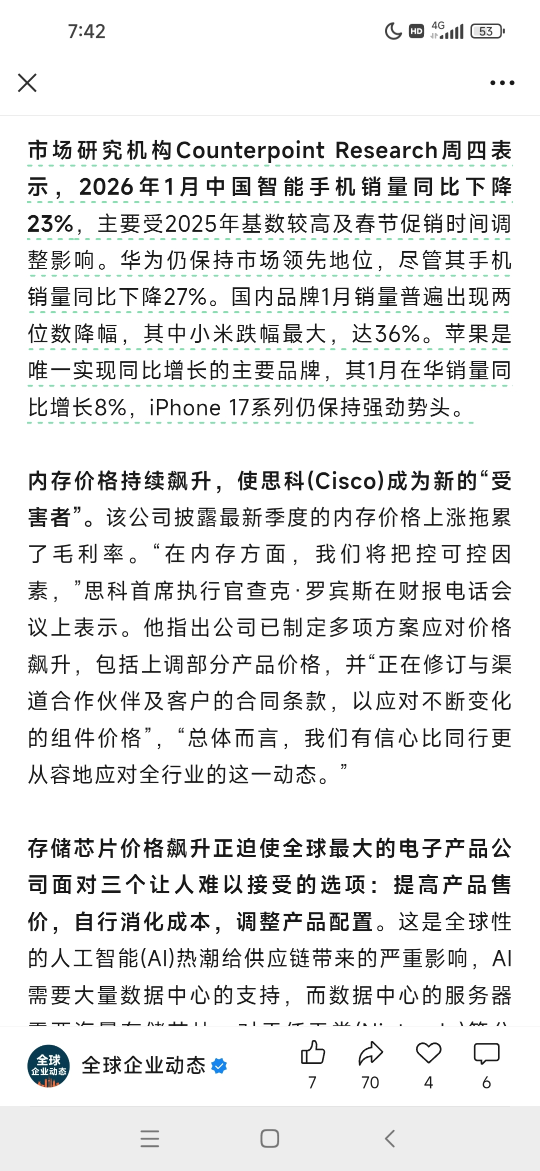 低端手机成本压力更大,这是不争的事实,股价反应一切