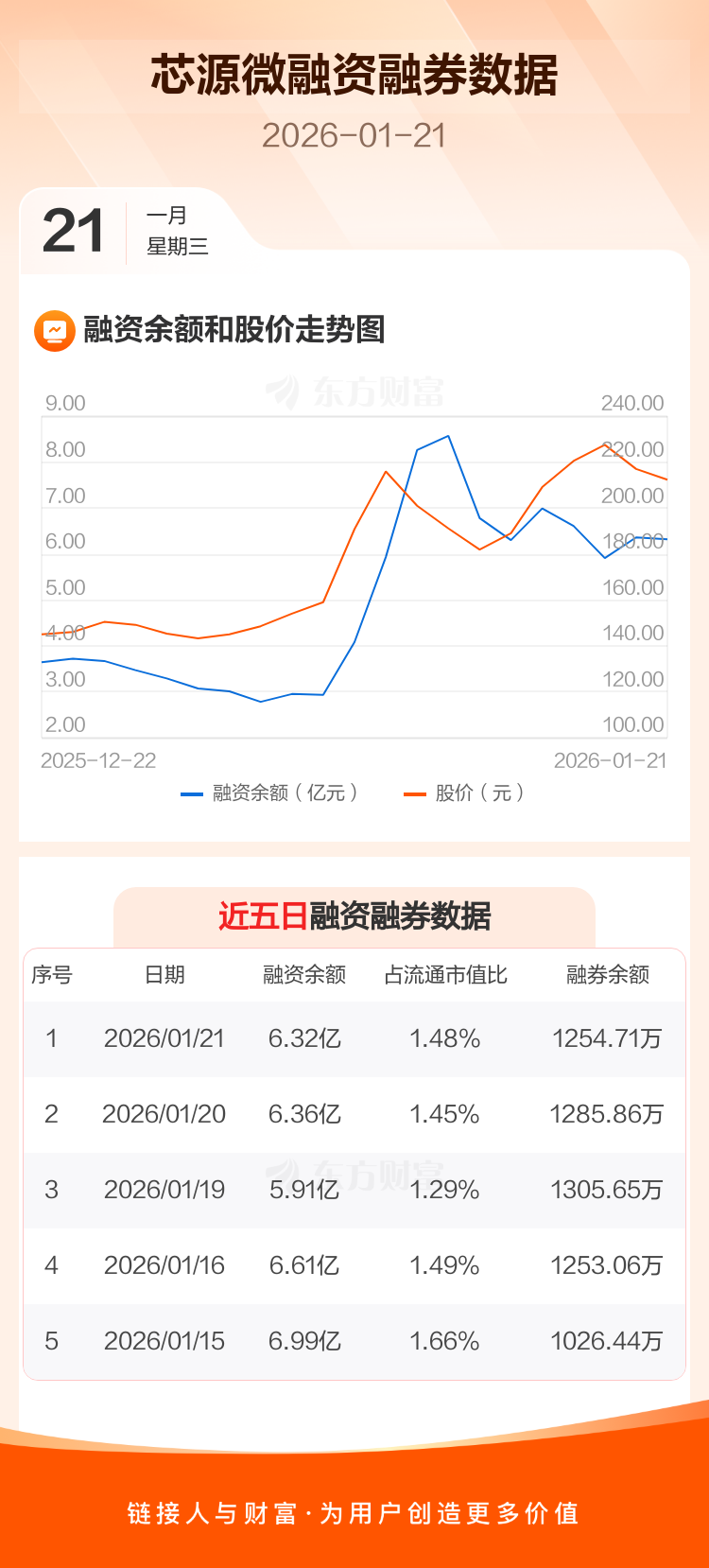 交易所最新数据显示,芯源微于2026年1月21日获融资买入1.09亿元,融资偿还1.13亿元,当日融资净偿还406.42万元。目前,该股融资余额6.32亿,占流通市值比例为1.48%。