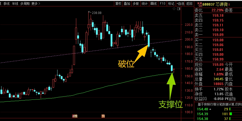 $芯源微(SH688037)$ 前期走势已经破位,当时就需要大幅减仓应对,不然连续回落到现在就很被动。短线这里重点是看脚底大均线153.59位置的支撑,能稳住就还能看个反抽动作,但如果稳不住就要注意继续破位的走势了,当下不考虑参与,谨慎应对。