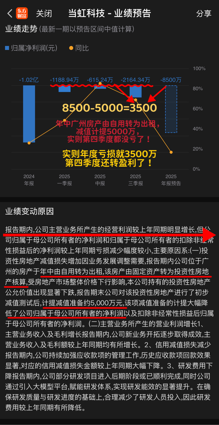 解读当虹科技年报预告算小利好吧!年中广州房产由自用转为出租,减值计提5000万,