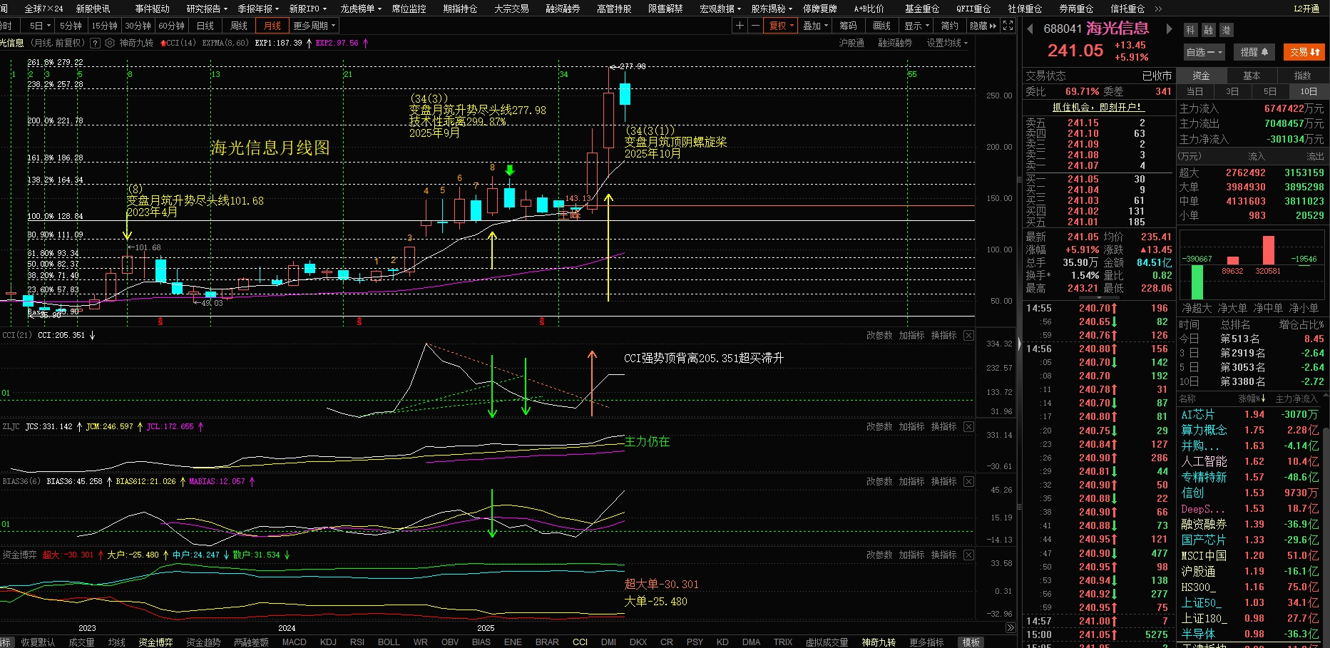 9月见顶277.98,正是斐波那契数列变盘敏感时,10月现收阴螺旋桨,双针277.98/273.33探顶技术性乖离近300%,与四季度变盘敏感时(13)、2025年变盘敏感时(3)共振,股价升跌必然选择方向,现在月月线已破黄金分割位238.2%257.28,此价位多空争夺叠加技术性乖离,就是投资者止盈止损位。