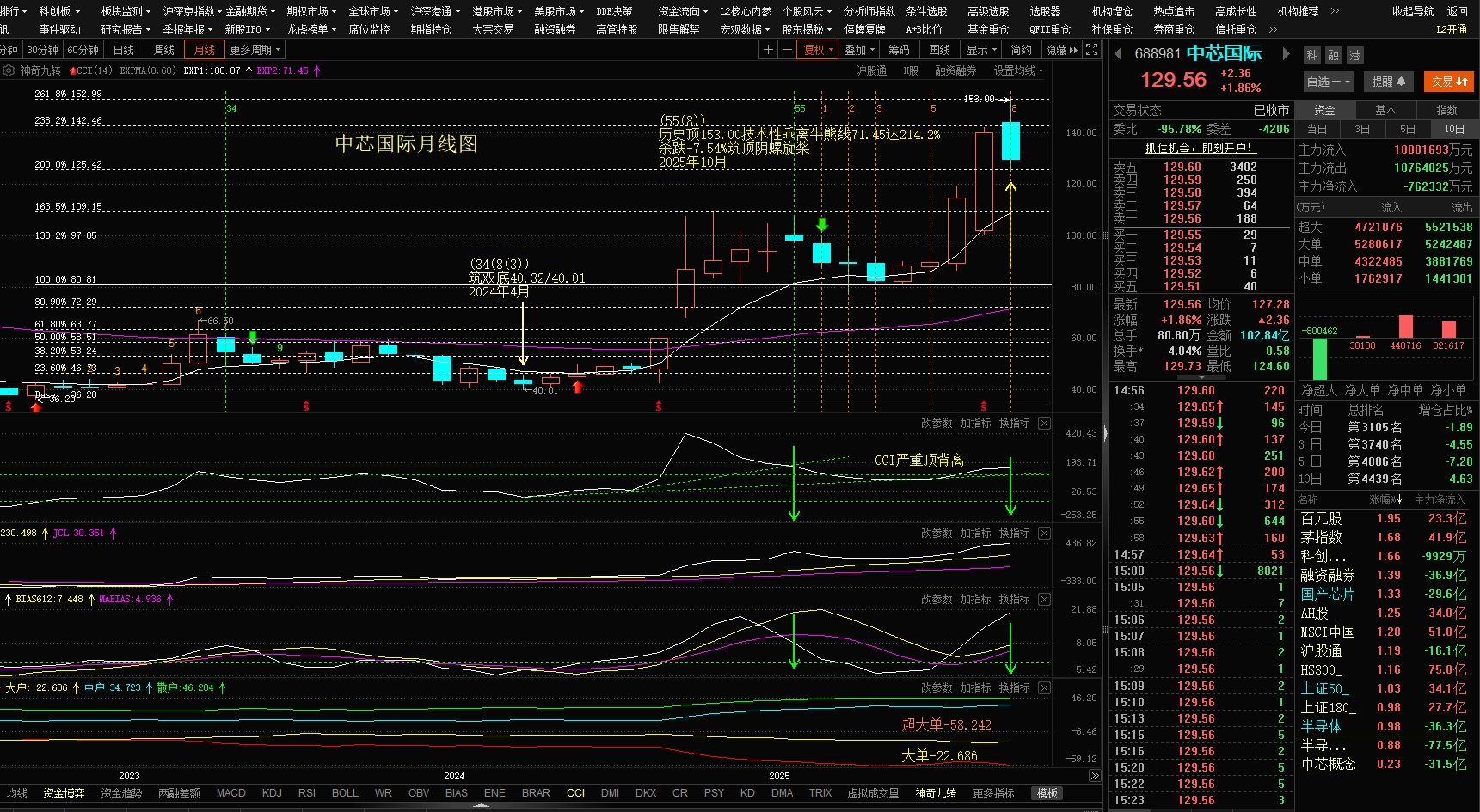 高风险区70分位市销率11.7,合理区50分位市销率8.85;以乐观年营收达693亿计算,现股价129.56下跌空间有-50%~-80%!参考H股价现76港元,也是变盘敏感月(233(21(5)),与变盘敏感年(21)共振必然选择方向,本月已构筑长上影阴螺旋桨,月技术性乖离更高达325.12%,参考英伟达本月顶195.62技术性乖离246.7%,中芯国际泡沫更大,英伟达同样构筑月阴螺旋桨,能量顶背离,11月见分晓。