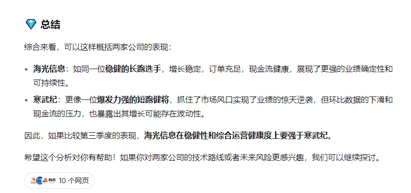 $海光信息(SH688041)$ 单从数据上看,海光的营收和利润,同比和环比双增。寒武纪的环比是下降的。另外海光三季度的研发投入是寒武纪的5倍。