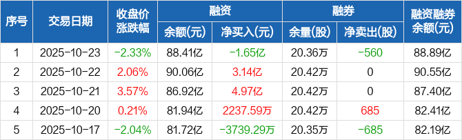 融资方面,当日融资买入6.16亿元,融资偿还7.81亿元,融资净偿还1.65亿元,净偿还额两市排名第八。融券方面,融券卖出1600股,融券偿还2160股,融券余量20.36万股,融券余额4808.58万元。融资融券余额合计88.89亿元。