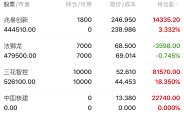 三花智控:今天终于放量走突破了,早上在方向中还说了,如果日内还不突破前高平台有合适的就会考虑把他换掉,结果今天还真起来了而且还是大阳突破,这也为后面打开新空间,有时候只要技术没走坏还是需要点耐心待张。