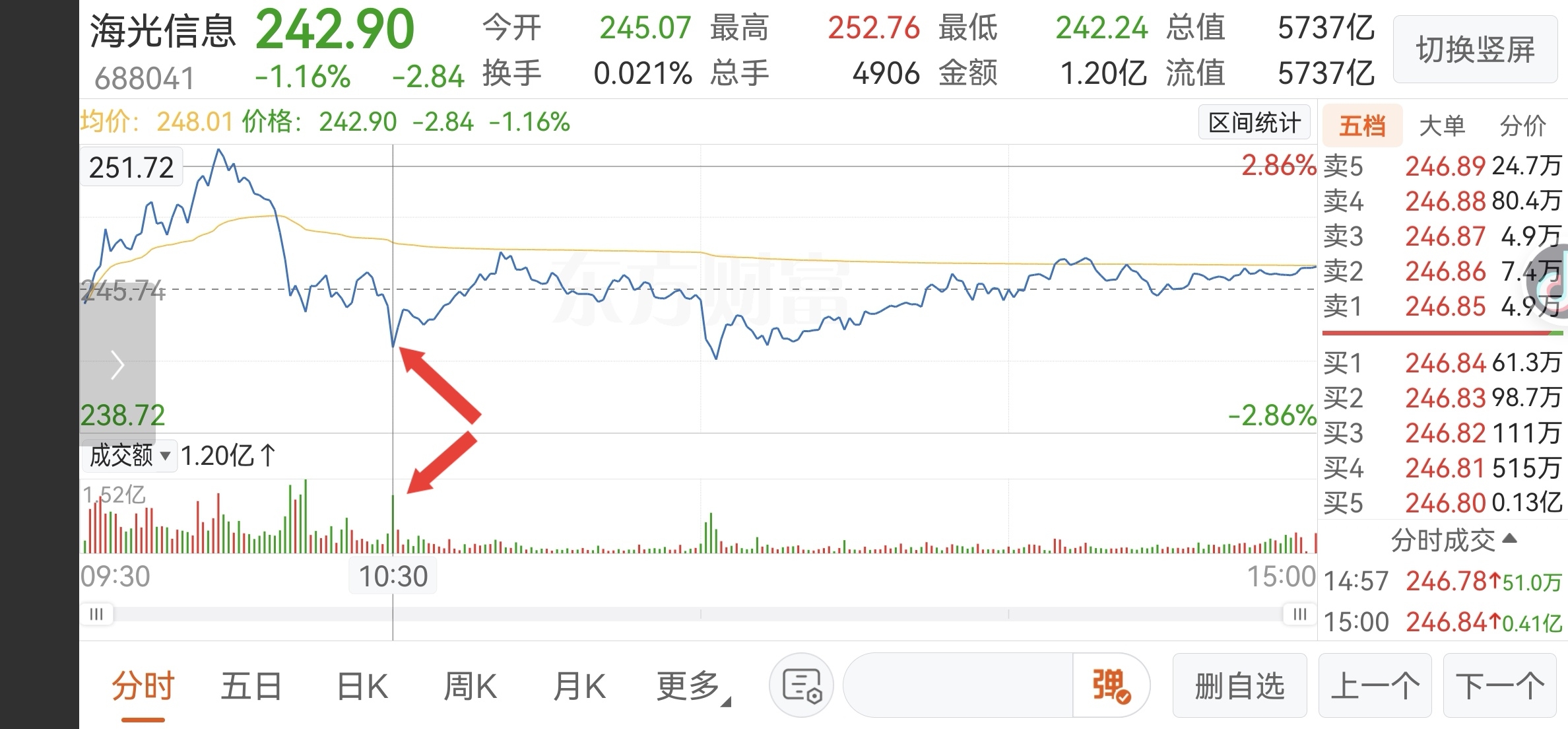 箭头所指应该是缩量,放量说明买盘增加,抛压被消耗掉后,股价立马回升,然后横盘震荡,有点意思。