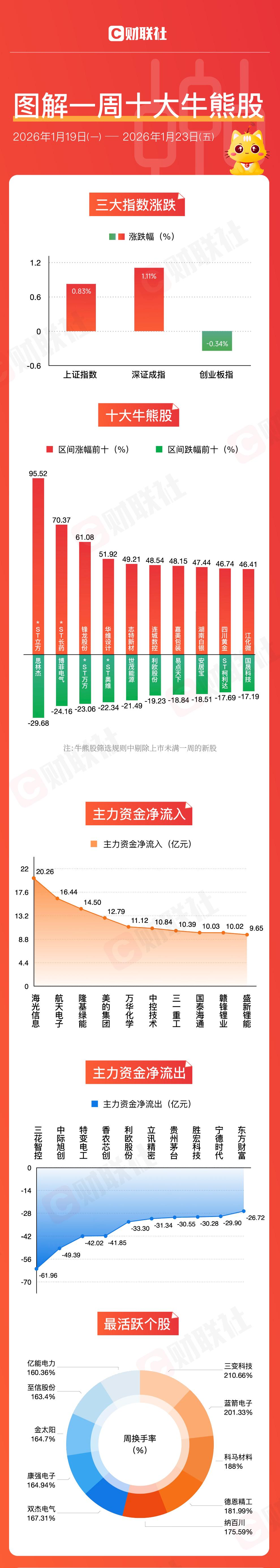 本周主力资金净流入方面,海光信息、航天电子主力资金净流入超15亿元。主力资金净流出方面,本周三花智控、中际旭创、特变电工、香农芯创净流出超40亿元。