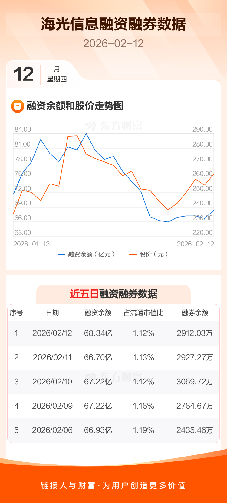 交易所最新数据显示,海光信息于2026年2月12日获融资买入5.07亿元,融资偿还3.44亿元,当日融资净买入1.64亿元。目前,该股融资余额68.34亿,占流通市值比例为1.12%。