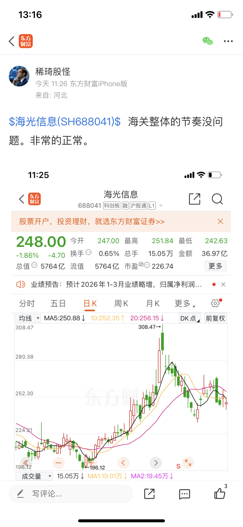 $海光信息(SH688041)$ 在这个市场上怎么有的人赚钱,有的人亏钱,有的人认为他进屋之后他就得大涨,他们要想到事物都有规律。