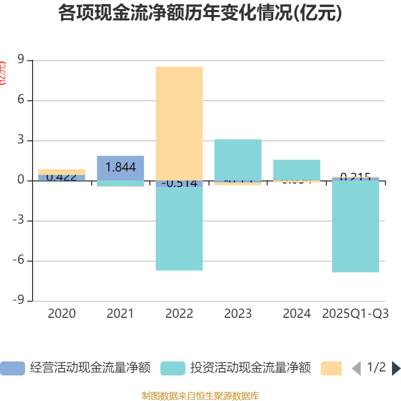 2025年前三季度,公司经营活动现金流净额为2152.48万元,同比增加3637.7万元;筹资活动现金流净额700.55万元,同比增加3125.06万元;投资活动现金流净额-6.87亿元,上年同期为-5.41亿元。
