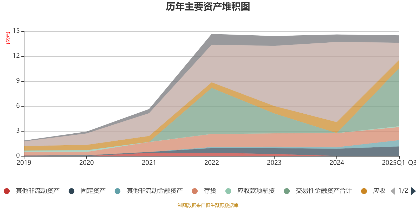 资产重大变化方面,截至2025年三季度末,公司货币资金较上年末减少78.76%,占公司总资产比重下降51.91个百分点;交易性金融资产合计占公司总资产的48.26%,上年末为0;其他非流动金融资产较上年末增加322.22%,占公司总资产比重上升4.01个百分点;应收票据及应收账款较上年末减少24.69%,占公司总资产比重下降2.18个百分点。