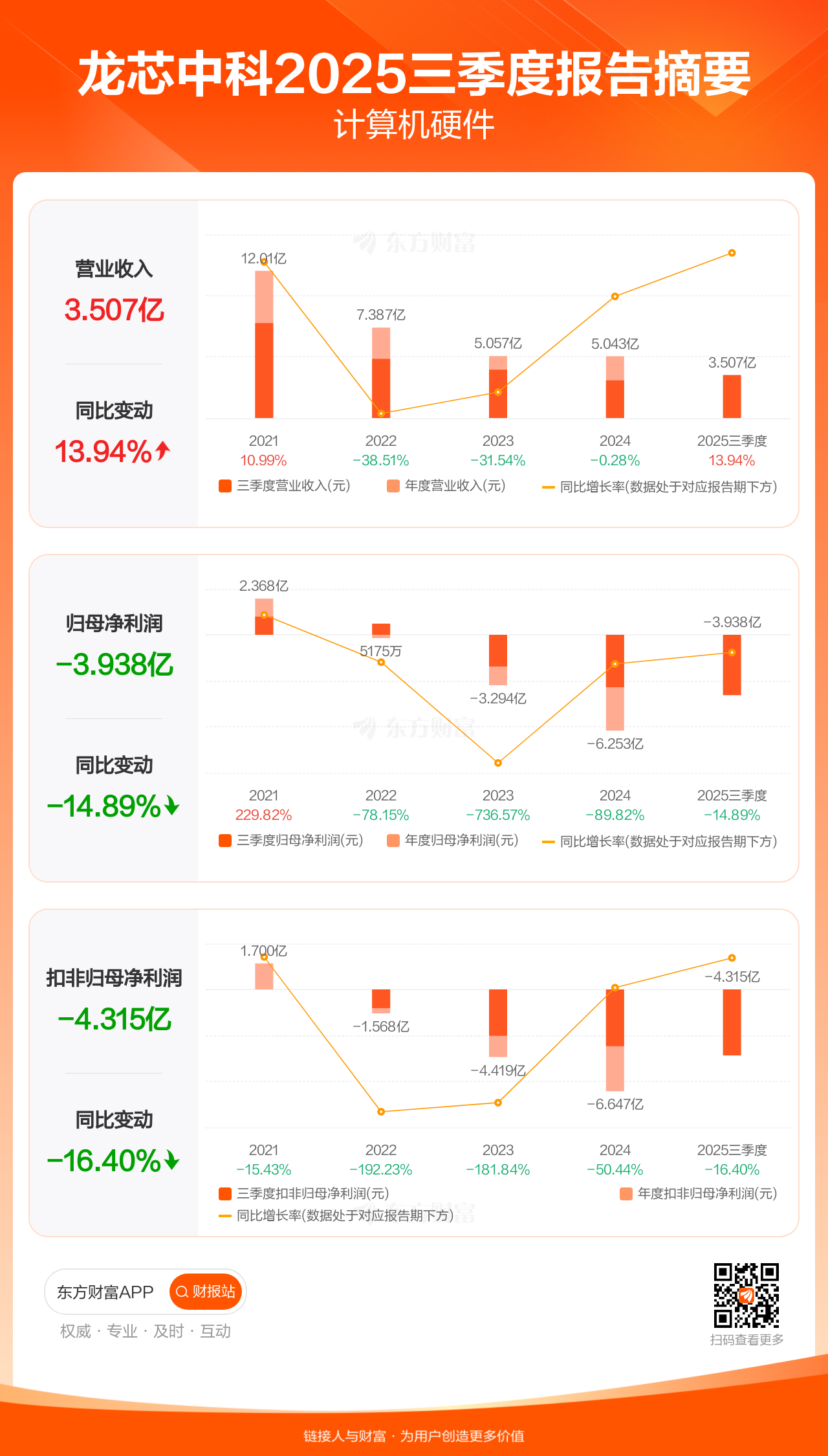 龙芯中科10月29日发布2025年三季报显示,公司前三季实现营业收入3.51亿元,同比增长13.94%;归母净利润-3.94亿元;扣非归母净利润-4.31亿元